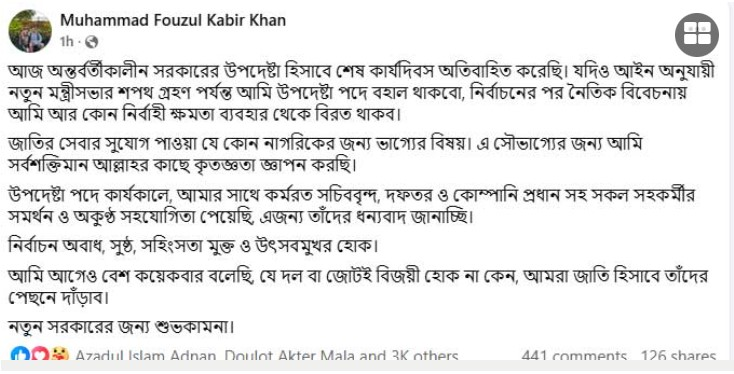 মঙ্গলবার (১০ ফেব্রুয়ারি) রাতে সামাজিক যোগাযোগমাধ্যম ফেসবুকে দেওয়া এক পোস্টে তিনি জানান, অন্তর্বর্তীকালীন সরকারের উপদেষ্টা হিসেবে এ দিন তার শেষ কার্যদিবস ছিল। তবে আইন অনুযায়ী নতুন মন্ত্রিসভার শপথ গ্রহণ পর্যন্ত তিনি উপদেষ্টা পদে বহাল থাকবেন বলেও উল্লেখ করেন।