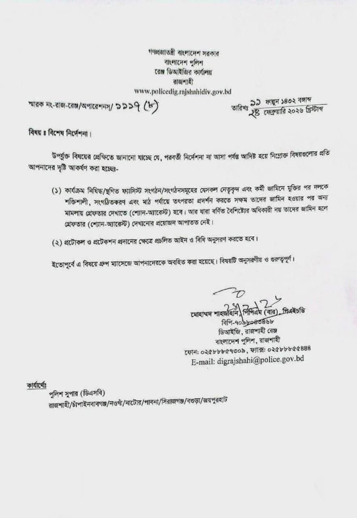 রাজশাহী রেঞ্জের আওতায় থাকা রাজশাহী, চাঁপাইনবাবগঞ্জ, নওগাঁ, নাটোর, পাবনা, সিরাজগঞ্জ, বগুড়া ও জয়পুরহাট—এই আট জেলার পুলিশ সুপারদের কাছে এই নির্দেশনা পাঠানো হয়েছে।