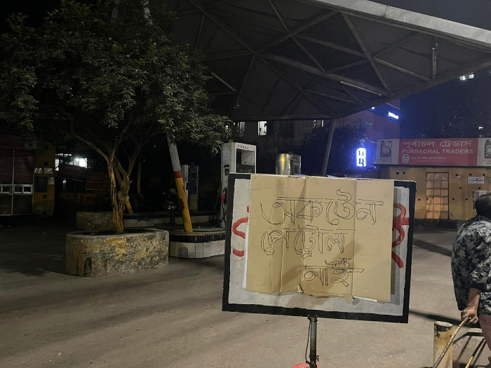 পাশেই রয়েছে পূর্বাচল ট্রেডার্স নামে আরেকটি ফিলিং স্টেশন। তারা অবশ্য সাইনবোর্ড ঝুলিয়ে জানিয়েছে, তাদের কাছে পেট্রোল ও অকটেন নেই। কারণ জানতে চাইলে নাম প্রকাশ না করার শর্তে প্রতিষ্ঠানটির একজন ম্যানেজার জানান, শুক্রবার ডিপো বন্ধ থাকায় তারা তেল সংগ্রহ করতে পারেননি।