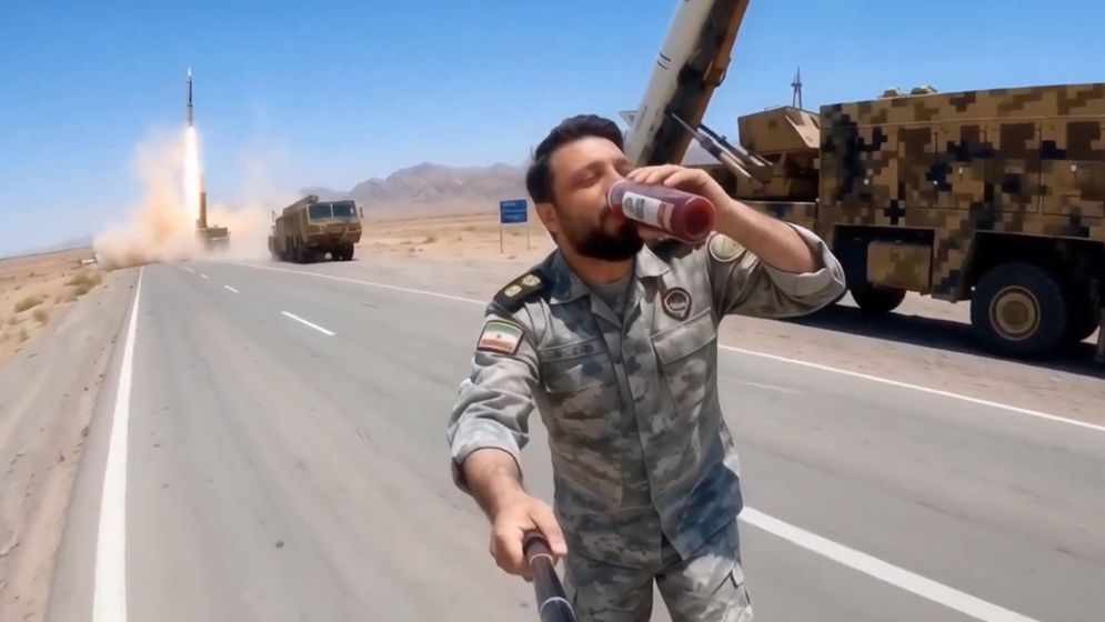 ছড়িয়ে পড়া ভিডিওতে দেখা যায়, ইরানের সশস্ত্র বাহিনীর যৌথ কমান্ড খাতাম আল-আম্বিয়া সেন্ট্রাল হেডকোয়ার্টারসের মুখপাত্র ইব্রাহিম জুলফাকারি স্কেটবোর্ডে সেলফি স্ট্যান্ড এক হাতে নিয়ে অন্য হাতে ডালিমের জুস পান করছেন। আর পেছনে লঞ্চ হচ্ছে মিসাইল।