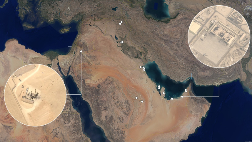 মধ্যপ্রাচ্যে মার্কিন ঘাঁটিতে প্রতিরক্ষা ব্যবস্থা ও আক্রমণমূলক অস্ত্রের মজুত। তথ্যসূত্র: রয়্যাল ইউনাইটেড সার্ভিসেস ইনস্টিটিউট