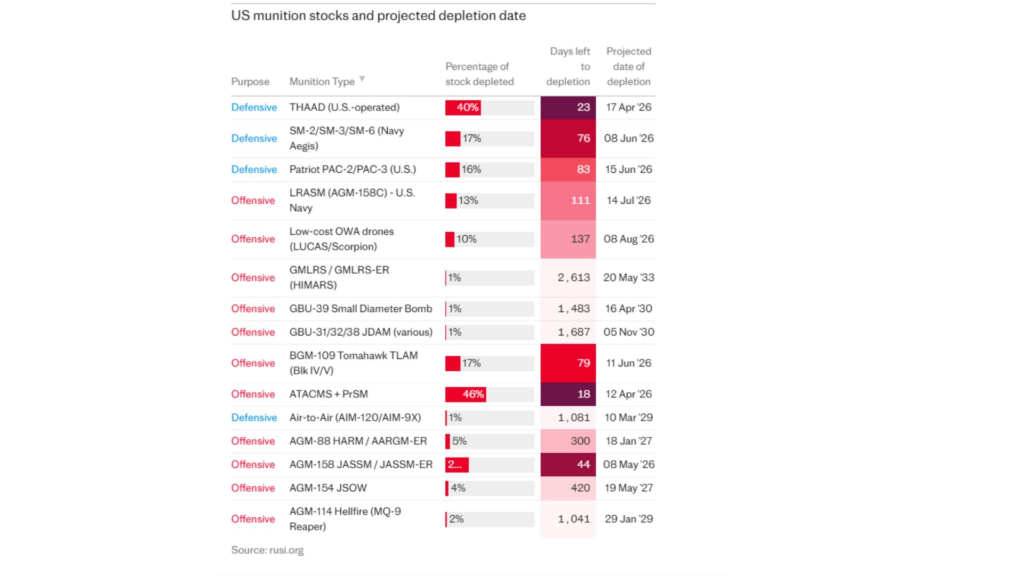 রয়্যাল ইউনাইটেড সার্ভিসেস ইনস্টিটিউটের তথ্য অনুযায়ী, মধ্যপ্রাচ্যে মার্কিন ঘাঁটিগুলোতে প্রতিরক্ষা ব্যবস্থার ওপর বেশি চাপ পড়েছে। এক মাসের যুদ্ধে থাডের মজুদ কমেছে ৪০ শতাংশ। এভাবে চললে আগামী ২৩ দিনের মধ্যে শেষ হয়ে যাবে থাডের মজুদ।