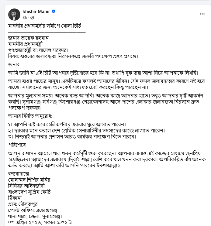 সুনামগঞ্জসহ হাওরাঞ্চলের কৃষকদের ফসল বাঁচাতে ও বৃষ্টির পানিতে সৃষ্ট জলাবদ্ধতা নিরসনে প্রধানমন্ত্রী তারেক রহমানকে খোলা চিঠি দিয়েছেন সুনামগঞ্জের শাল্লা উপজেলার বাসিন্দা ও বাংলাদেশ সুপ্রিম কোর্টের সিনিয়র আইনজীবী মোহাম্মদ শিশির মনির।