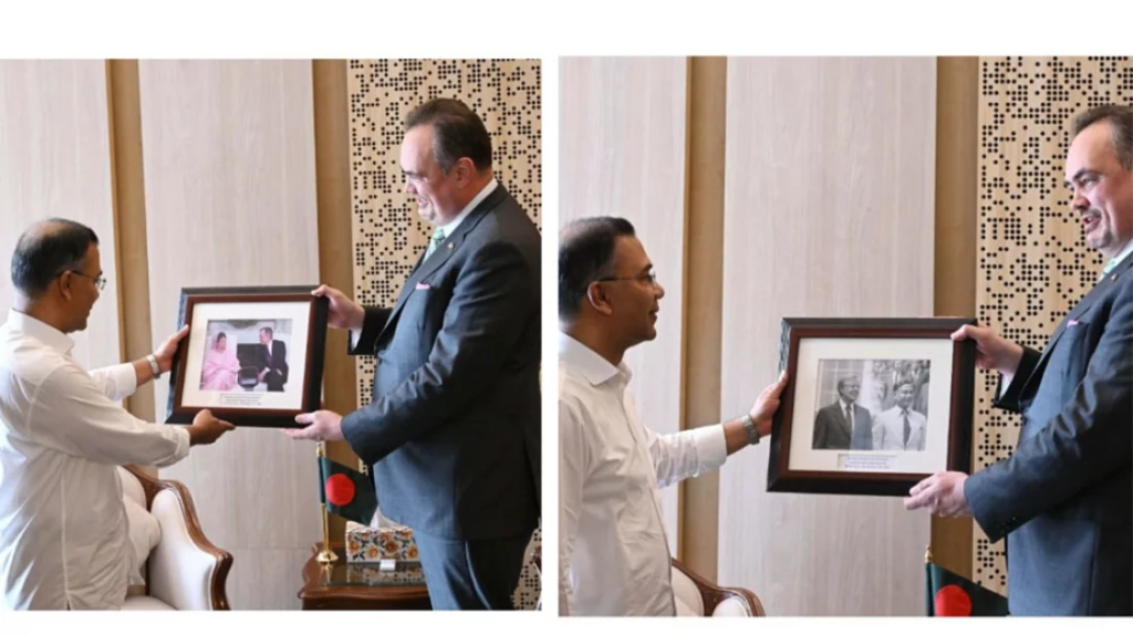 রাষ্ট্রদূত এ সময় প্রধানমন্ত্রী তারেক রহমানের হাতে দুটি ছবি এবং হোয়াইট হাউসের একটি রেপ্লিকা তুলে দেন। একটি ছবিতে রয়েছেন শহীদ প্রেসিডেন্ট জিয়াউর রহমান ও প্রয়াত মার্কিন প্রেসিডেন্ট জিমি কার্টার। অপর ছবিতে রয়েছেন সাবেক প্রধানমন্ত্রী বেগম খালেদা জিয়া ও সাবেক মার্কিন প্রেসিডেন্ট জর্জ বুশ সিনিয়র।