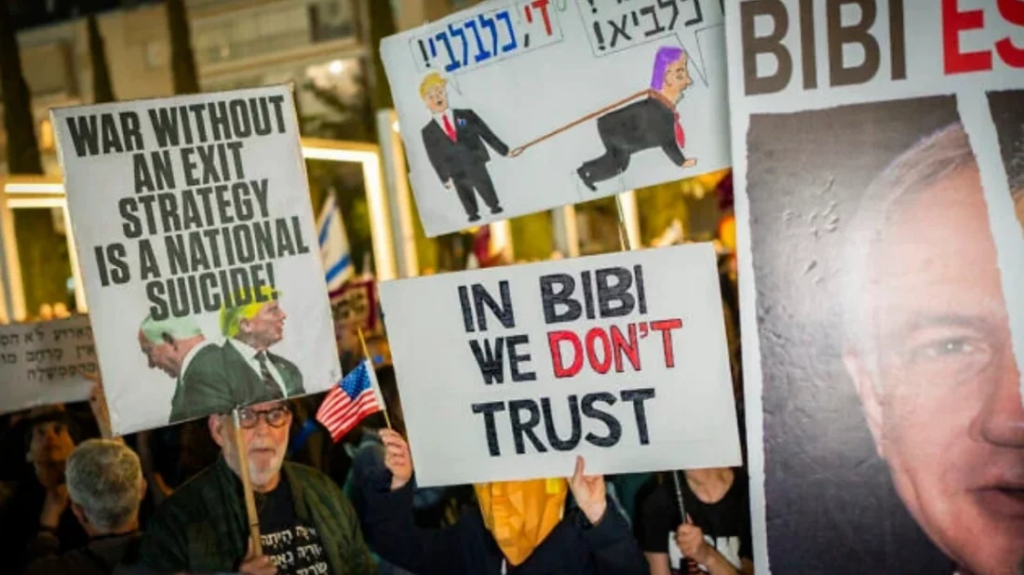 ইসরায়েলের তেল আবিব–এ সরকারবিরোধী ও ইরান যুদ্ধের প্রতিবাদে আয়োজিত এক বড় সমাবেশে আদালতের নির্ধারিত জনসমাগমের সীমা অতিক্রম করেছেন হাজার হাজার বিক্ষোভকারী