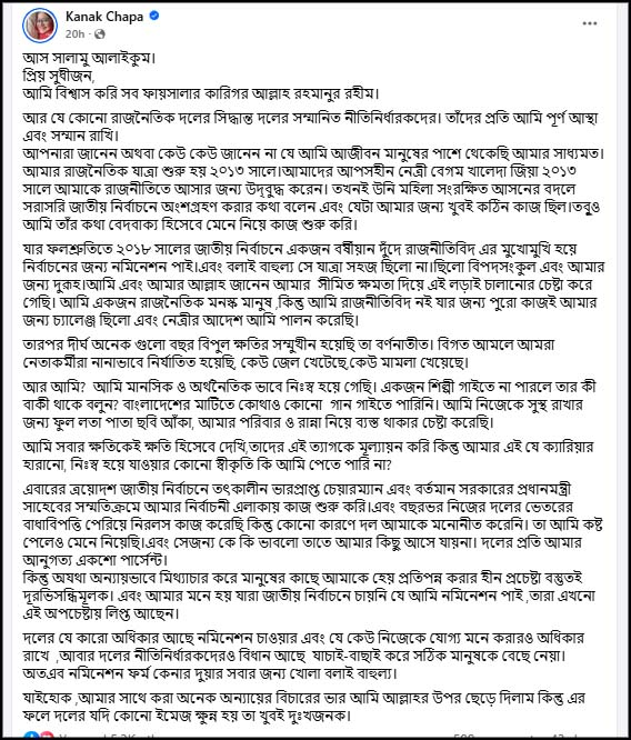 কনকচাঁপা লিখেছেন, ‘আমি বিশ্বাস করি সব ফায়সালার কারিগর আল্লাহ রহমানুর রহীম। আর যেকোনো রাজনৈতিক দলের সিদ্ধান্ত দলের নীতিনির্ধারকদের। তাদের প্রতি আমি পূর্ণ আস্থা এবং সম্মান রাখি। আপনারা জানেন অথবা কেউ কেউ জানেন না যে, আমি আজীবন মানুষের পাশে থেকেছি আমার সাধ্যমত। আমার রাজনৈতিক যাত্রা শুরু হয় ২০১৩ সালে। আমাদের আপসহীন নেত্রী বেগম খালেদা জিয়া ২০১৩ সালে আমাকে রাজনীতিতে আসার জন্য উদ্বুদ্ধ করেন। তখনই উনি মহিলা সংরক্ষিত আসনের বদলে সরাসরি জাতীয় নির্বাচনে অংশগ্রহণ করার কথা বলেন এবং যেটা আমার জন্য খুবই কঠিন কাজ ছিল। তবু্ও আমি তার কথা বেদবাক্য হিসেবে মেনে নিয়ে কাজ শুরু করি।’
